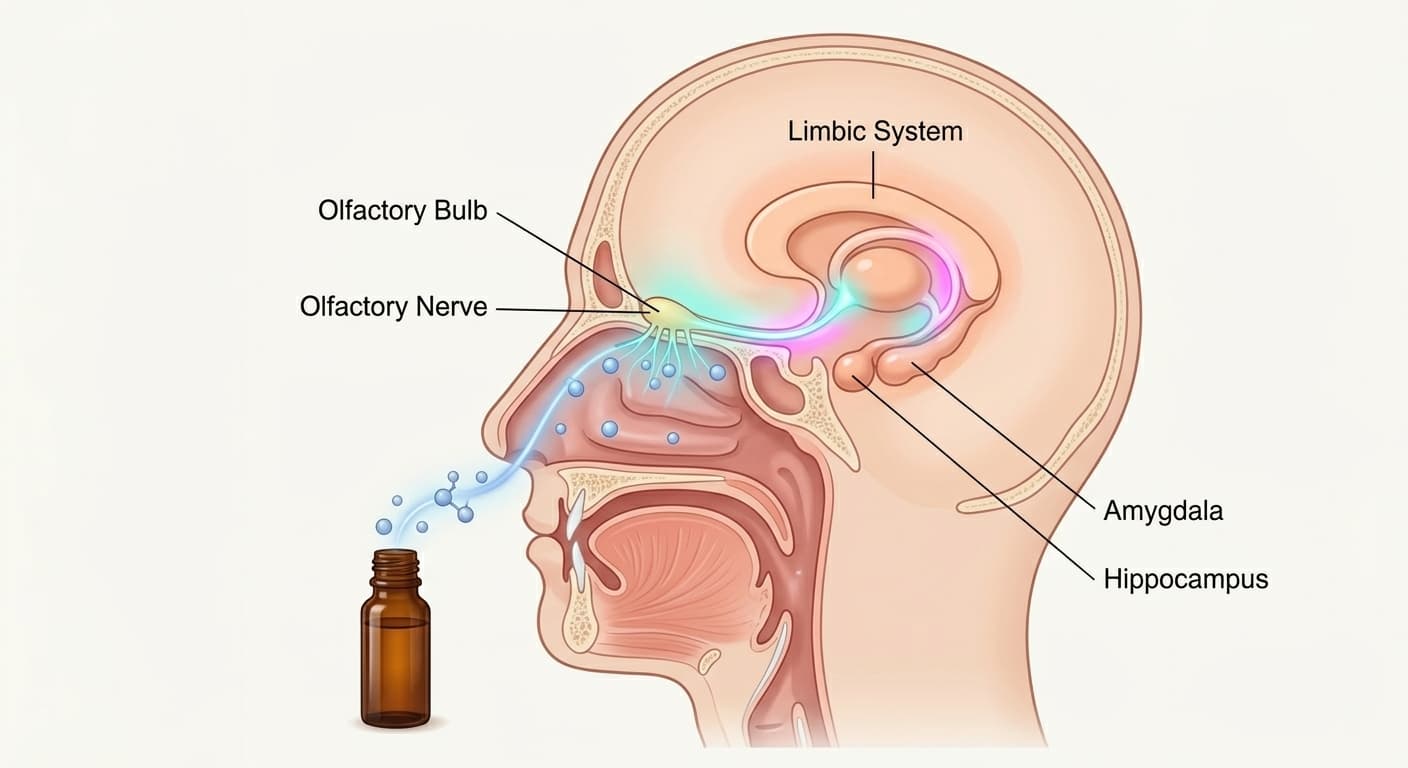 When you inhale an essential oil, the aromatic molecules travel through your nose to the olfactory bulb - the part of your brain that processes smell. The olfactory bulb has a direct neural connection to the limbic system, which is the brain's emotional processing center and the same system involved in the anxiety response. No other sensory input has this direct a pathway to the limbic system. This is why scent can trigger emotional states faster than sight, sound, or touch.