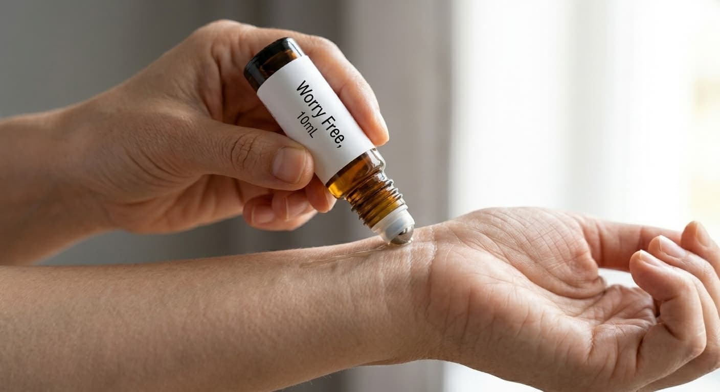 For acute anxiety moments, place 1–2 drops on your palms, rub them together, cup your hands over your nose and mouth, and inhale slowly for 3–5 breaths. This is the fastest delivery method and works well for panic-adjacent moments when you need immediate effect. The Worry Free roll-on is designed for this method.